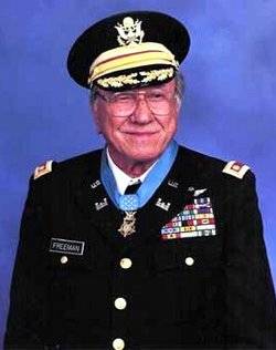 Freeman and his commander, Major Bruce Crandall, volunteered to fly their unarmed, lightly armored UH-1 Huey in support of the embattled troops. Freeman made a total of fourteen trips to the battlefield, bringing in water and ammunition and taking out wounded soldiers under heavy enemy fire in what was later named the Battle of Ia Drang. By the time they landed their heavily damaged Huey, Captain Freeman had been wounded four times by ground fire.[5]