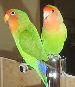 Very sweet Love Birds and easy to take care of. Give them a box and they will make their own nest and start laying eggs. No babies yet, maybe they still have to get thier act right. |