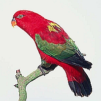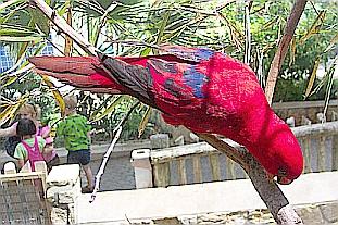 The Red Lory is a stinker (Actually all lories are). As they have a more liquid diet of nectar, juices and fresh fruits, their poop is watery and it is quite a job to keep their cagers clean. They are extremely atractive with thier dark red body and blue/black streaks across their head. |