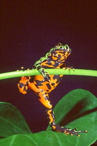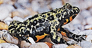 The Fire Belly Toad's coloration ranges from grass green to forest green with black blotches. The underbelly ranges from a flame red to a weak orange in color.. The brightly colored belly acts as warning coloration to other species. The fire belly toad secretes a toxin when stressed. |
