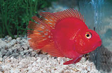 The Red Parrot Fish is a human creaed hybrid species, this fish adds a touch of color in an African cichlid aquarium and can adapt very easily to the water conditions of such a tank. |