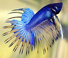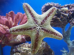 Chocolate Chip Starfish are very graceful. Ours come up to the top surface to be fed by hand. A piece of thawed frozen fish is whatthey will devoure after liquefying it in the center of its body. The amazing fact about starfish isthat if you into small piees which has a piece of the center, each piece will grow up to be a separate starfish in due time. The regeneration is possible due to the vital organs kept in their arms. |