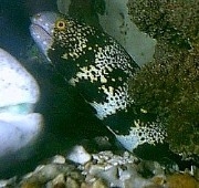 This eel is white to off-white in color with black and yellow spots formed in patterns like snowflakes on the body, thus the name Snowflake Eel |